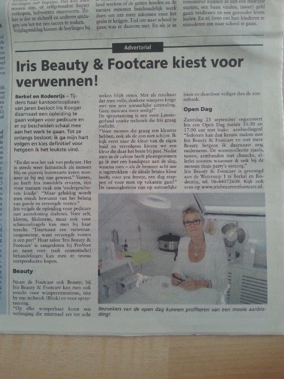 Nieuwsfeiten Sinds 23 maart 2015 verzorg ik ook uw Wenkbrauwextenions! Iris Beauty & Footcare komt naar u toe met de nieuwe huisstijl op de auto. 24 jan 2014 In de media november 2013